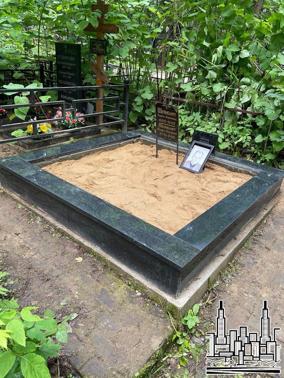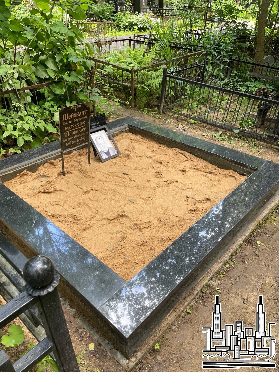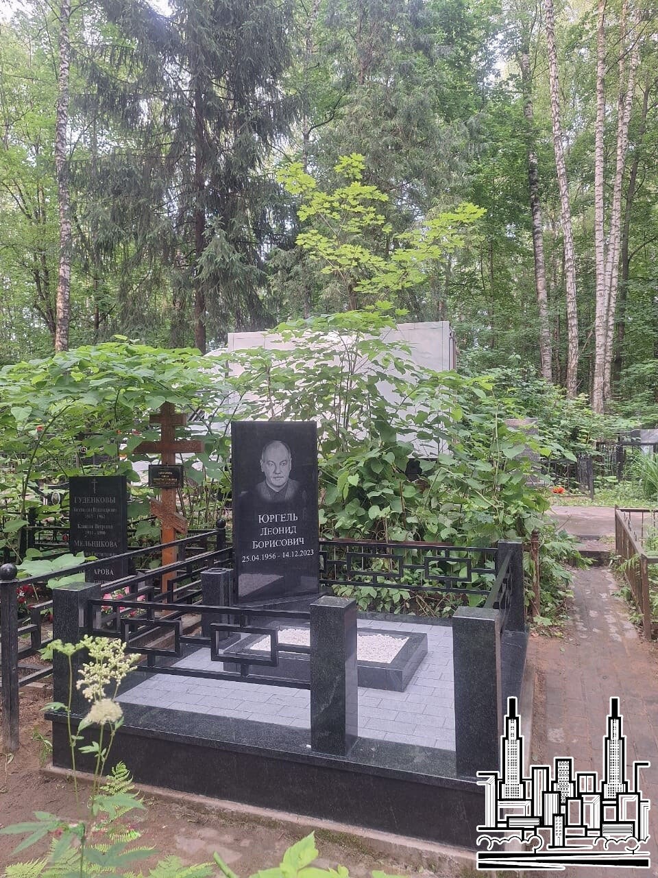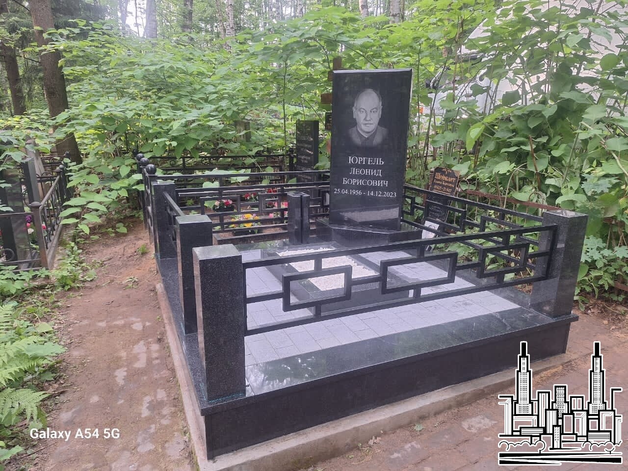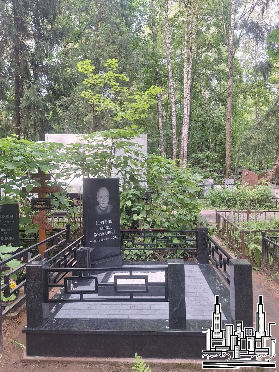 Установлен памятник из чёрного гранита с портретной гравировкой.