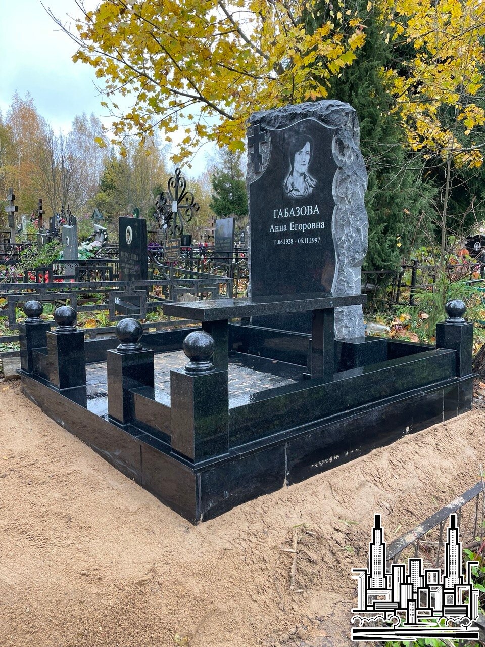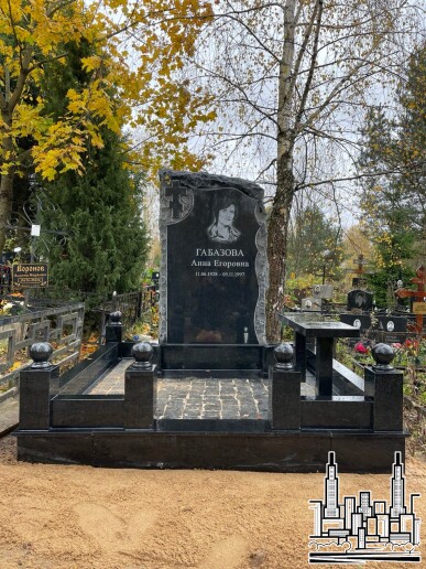 - Изготовление и установка резного памятника из чёрного габбро-диабаза в технике «корка» (задняя часть — дикий камень).