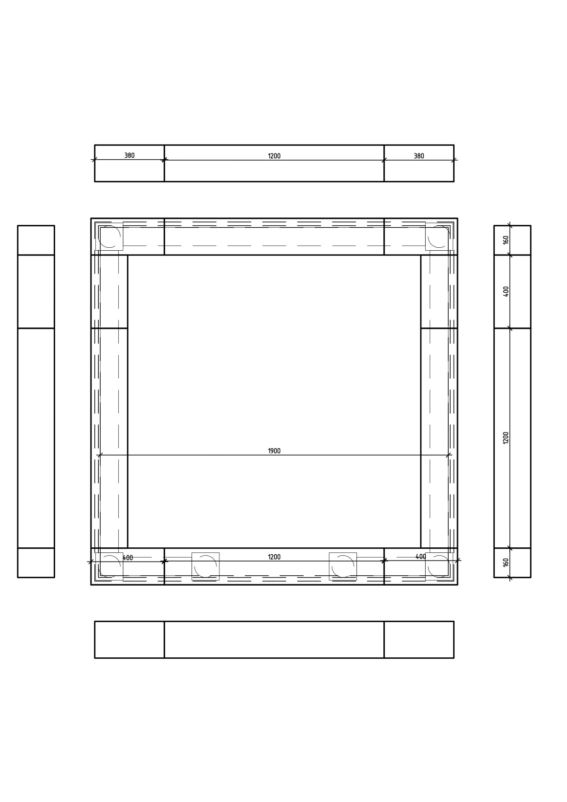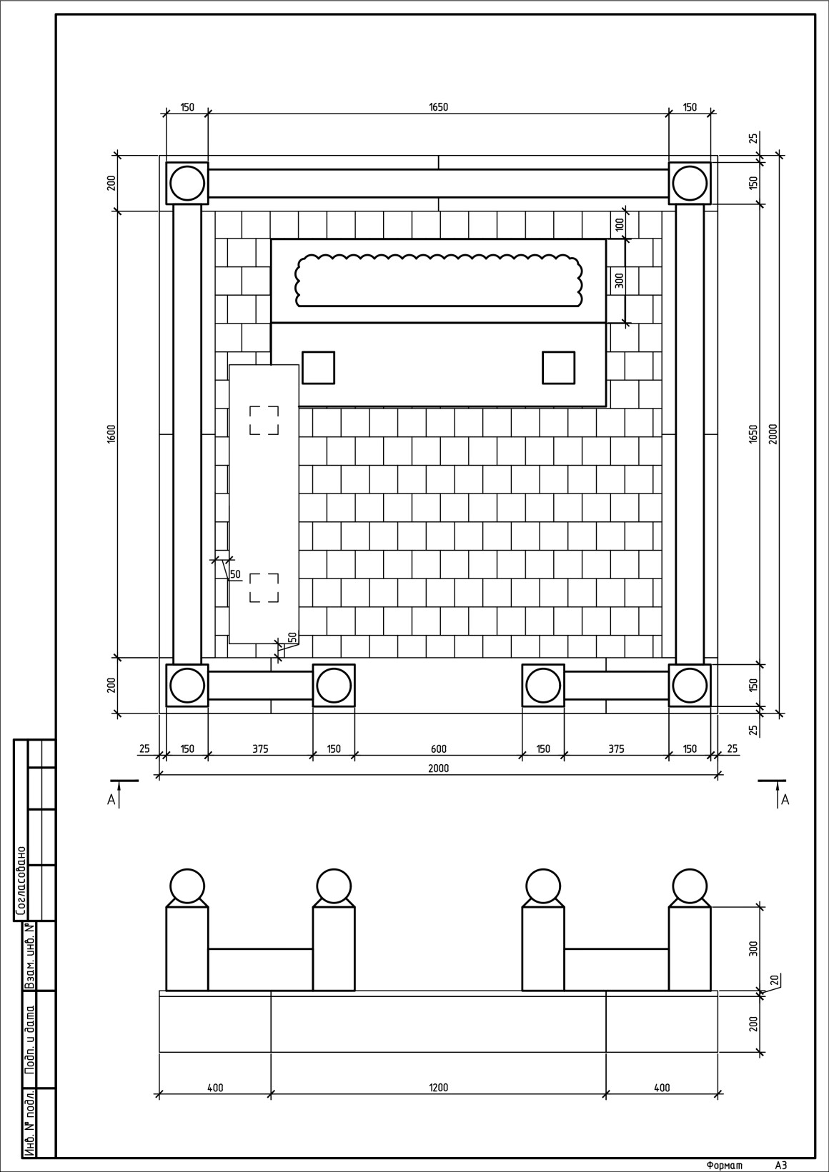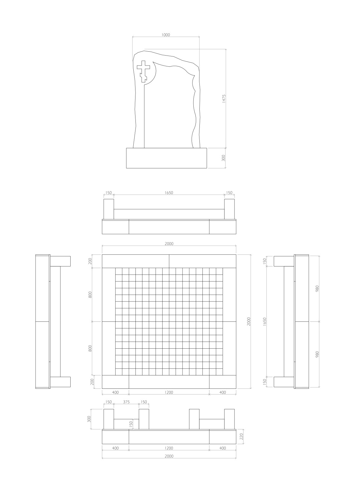 Площадка — 2000 × 2000 мм (200 × 200 см). Размер стелы — 1000 × 1475 мм. Высота цоколя — 200 мм. Столбики — 150 × 150 мм, высота над цоколем — 300 мм.
